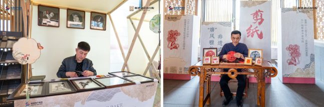 剪纸展位。剪纸艺术展演俨然成为亲子家庭的热门打卡地。剪纸历史悠久,与民俗活动相伴,生活气息浓厚,广泛应用于生活装饰及节庆婚嫁等各种民俗活动,其中炕围花、嫁妆盒最具特色,具有较高的审美和收藏价值。现场体验环节,大师手把手教授”四折八剪法”,参与者可创作专属生肖剪纸,体验”方寸之间见天地”的艺术魅力。