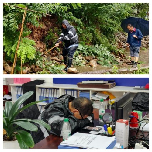 暴雨马上就要来了,大家抓紧转移!接到预警后,县人大代表何仁兴第一时间想到的是村上的几位“特殊”群众。晚上8点,他打着手电和其他几位代表,挨家挨户敲开危险区域群众的家门。面对部分村民的犹豫,他反复劝说:“财产丢了能再挣,人没了啥都没了!”深夜1点半暴雨如注时,已转移群众33人至村委会安置点。次日清晨河水暴涨、河堤告急,他再次冲到危险区挨户劝导。直到下午雨势渐歇,连续奋战了20多个小时的何仁兴才终于松了口气。他靠在村委会的办公桌上,连雨衣都来不及脱就睡着了。这个画面,被路过的村民悄悄拍下这张照片成为代表担当最动人的注脚。